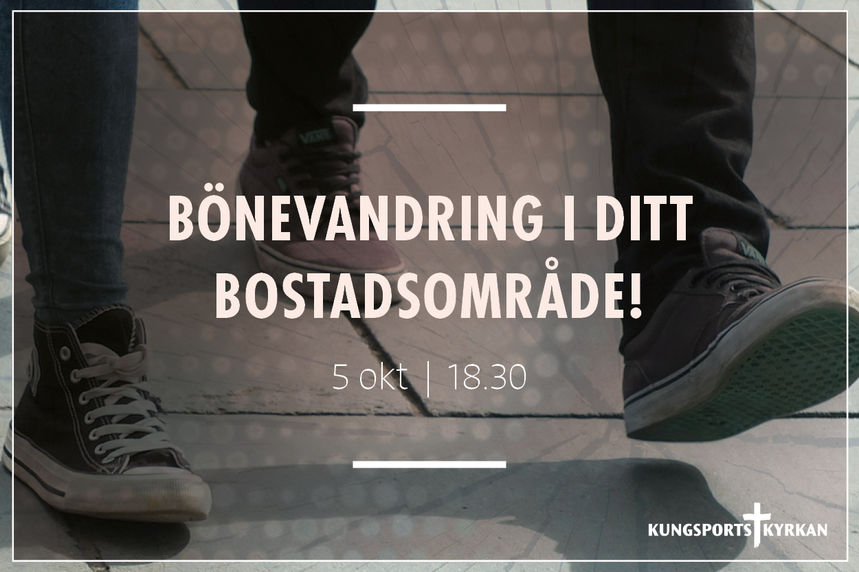 Vi tänker oss att ni avsätter en timme eller mer och gör en vandring i bostadsområdet där du/ni bor. När ni passerar skolor, arbetsplatser, kyrkor, föreningslokaler, bostäder mm låter ni det få bli er bönemanual. Be för personer och aktiviterar som tar plats i de lokalerna. Be också om att Gud ska använda er och ge er hälsningar och ord till personer ni möter.