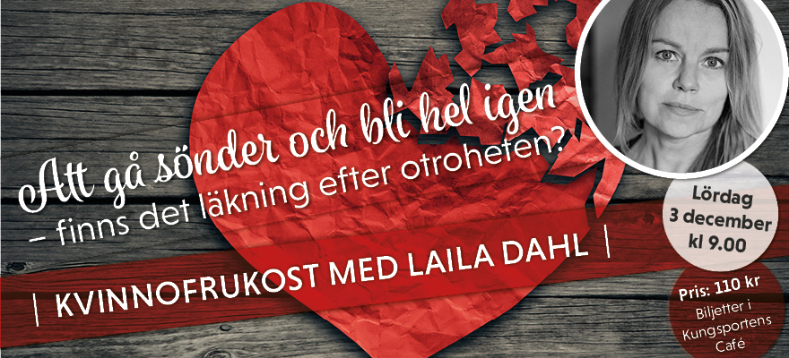 Välkommen till kvinnofrukost med Laila Dahl, lördag 3 december kl 9.00. Laila är par- och relationsterapeut, artist och författare och hon kommer att föreläsa kring sin uppmärksammade bok “Att gå sönder och bli hel igen - finns det läkning efter otroheten?".