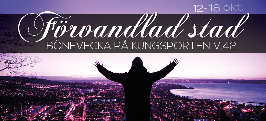 12-18 okt har vi en bönevecka på Kungsporten där vi tillsammans ber för en förvandlad stad! Vi uppmuntrar dig att komma på våra ordinarie bönesamlingar men också att åka ut till strategiska platser och be. Söndag 18 oktober har vi en extra samling - en ekumenisk bönekväll där vi tillsammans med representanter från flera andra kyrkor söker stadens bästa.