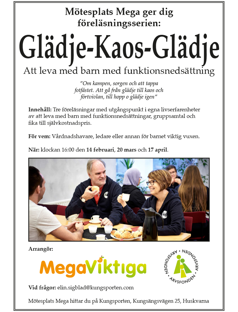 I vår ger Mötesplats Mega dig föreläsningsserien "Glädje-Kaos-Glädje", om att leva med barn med funktionsnedsättningar.