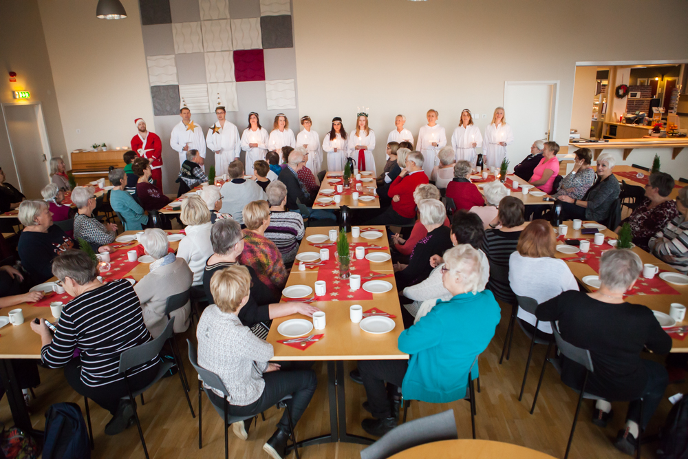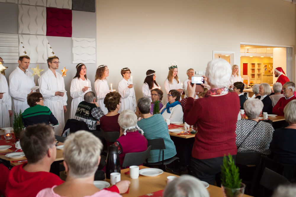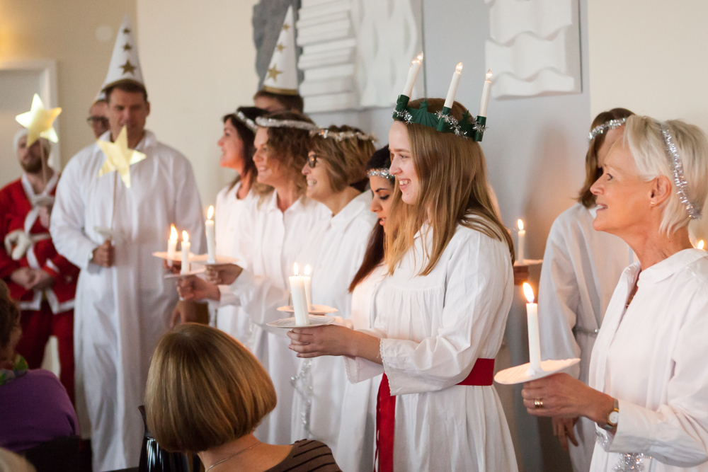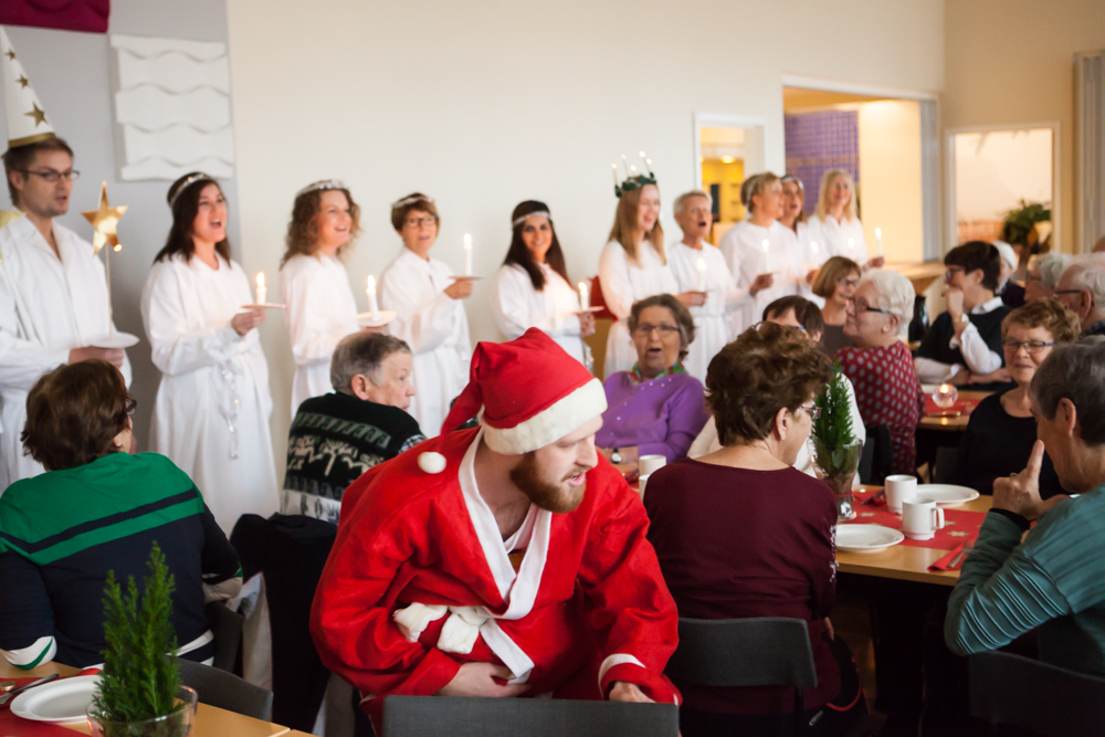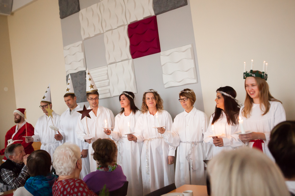 Förskolan kunde inte delta med ett luciatåg på 60-plus-gympans julavslutning som de brukar. Då fick Åsa Björk den geniala idén att dra ihop medarbetarna på Kungsporten.