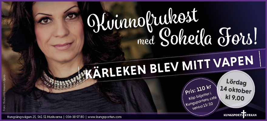 Välkomna till kvinnofrukost med Soheila Fors, lördag 14 oktober kl 9.00! Kom och lyssna till denna modiga och inspirerande kvinna, som är en röst för dem som inte har en röst. Rubriken för föreläsningen är "Kärleken blev mitt vapen" och Soheila kommer att dela personligt från sitt liv.