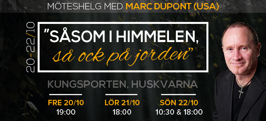 Vi ser fram emot en spännande möteshelg med Marc Dupont, 20-22 oktober på Kungsporten. Temat är "Såsom i himmelen, så ock på jorden". Marc har en stark profetisk gåva och vi har stor förväntan på vad Gud vill göra denna helg!