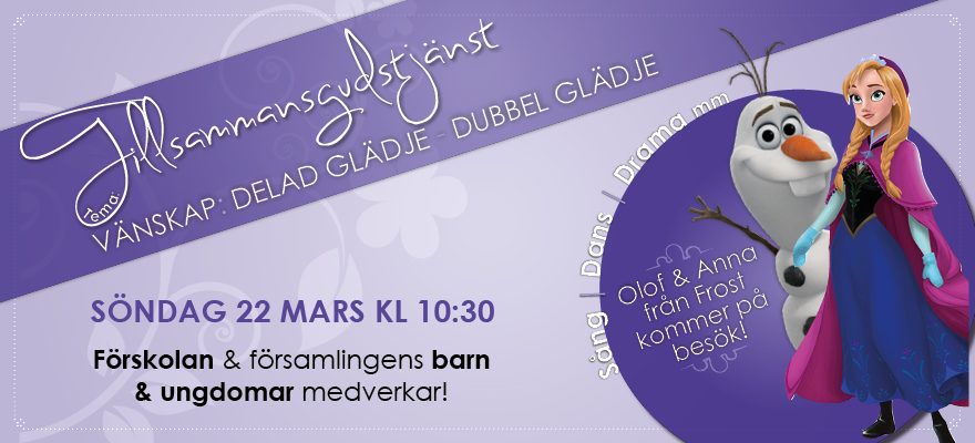 På söndag är alla stora och små välkomna på tillsammansgudstjänst där ni bland annat får möta Olof och Anna från filmen Frost! :)