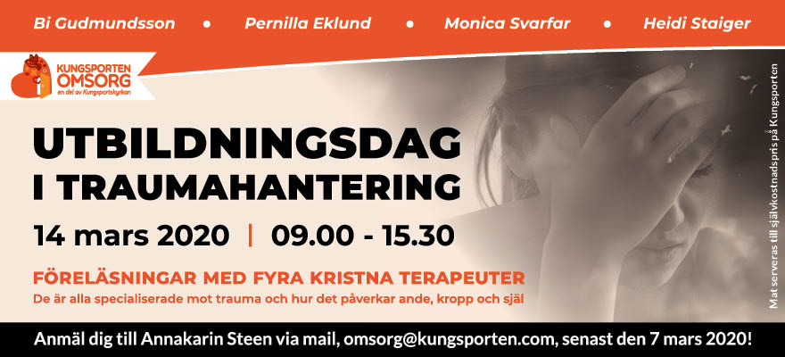 Omsorgsrådet vill inbjuda er och dem ni har i era nätverk till en utbildningsdag i traumahantering på Kungsporten lördagen den 14 mars. Det är fyra kristna terapeuter som är specialiserade mot trauma och hur det påverkar en människa som kommer hålla i föreläsningarna. Ämnena under dagen är följande:- Vad är övergrepp och vad händer med den som blivit utsatt?