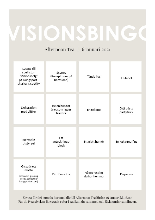Visionsbingo: Delta gärna i vårt Visionsbingo i samband med Afternoon Tea. OBS! För att tävla i bingot behöver du skicka in bildbevis på ditt bingo och namn till anmalan@kungsporten.com SENAST på lördag kl. 16.10. Kryssa för det som du har med dig till Afternoon Tea. Har du fyra i rad så har du chans att vinna ett pris som lottas ut under samlingen. Ladda ner visionsbingot HÄR. (Till Spotifylista eller se Recept på scones)