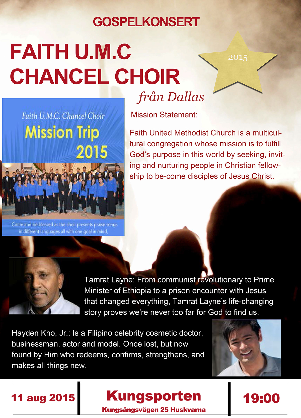 Välkommen till en spännande gospelkväll, tisdag 11 augusti kl 19.00. Faith U.M.C Chancel Choir från Dallas besöker oss och har med sig två speciella gäster. Kören kommer från en internationell församling där många medlemmar har amerikanskt/filippinskt ursprung.