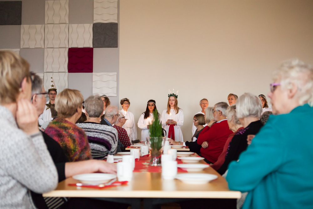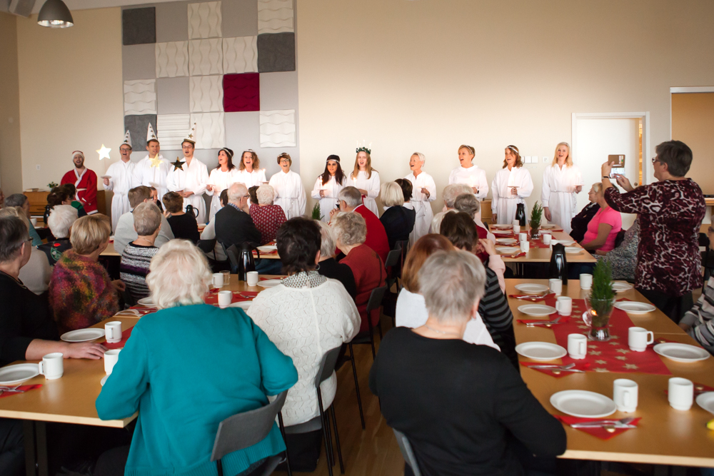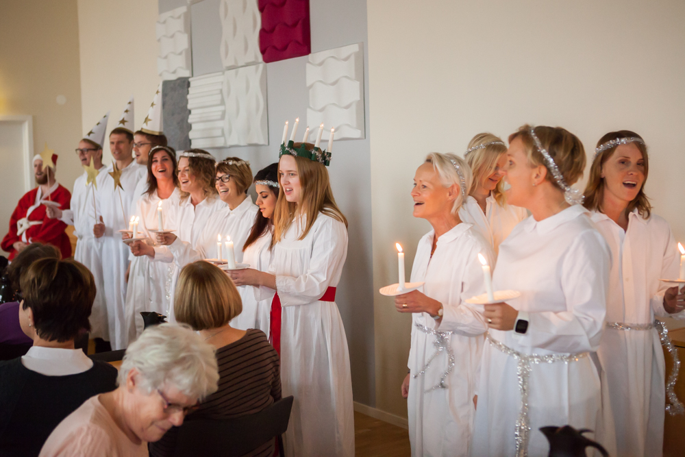 Förskolan kunde inte delta med ett luciatåg på 60-plus-gympans julavslutning som de brukar. Då fick Åsa Björk den geniala idén att dra ihop medarbetarna på Kungsporten.