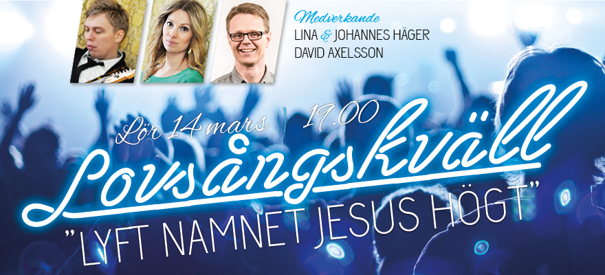 Välkomna till en lovsångskväll med Lina och Johannes Häger samt David Axelsson där vi tillsammans lyfter namnet Jesus högt!Lördag 14 mars kl 19:00 på Kungsporten. PS. Vi lovar att det blir mycket bättre än melodifestivalen!