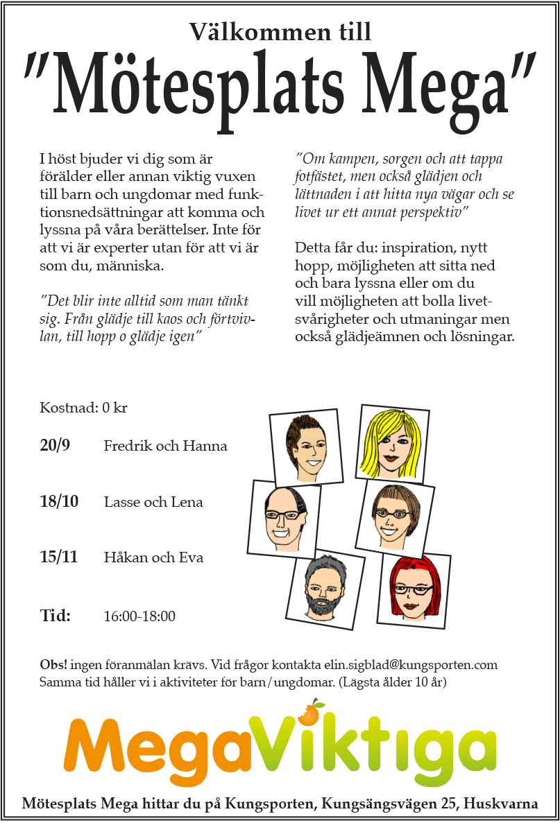 I höst bjuder vi dig som är förälder eller annan viktig vuxen till barn och ungdomar med funktionsnedsättningar att komma och lyssna på våra berättelser. Inte för att vi är experter utan för att vi är som du, människa.