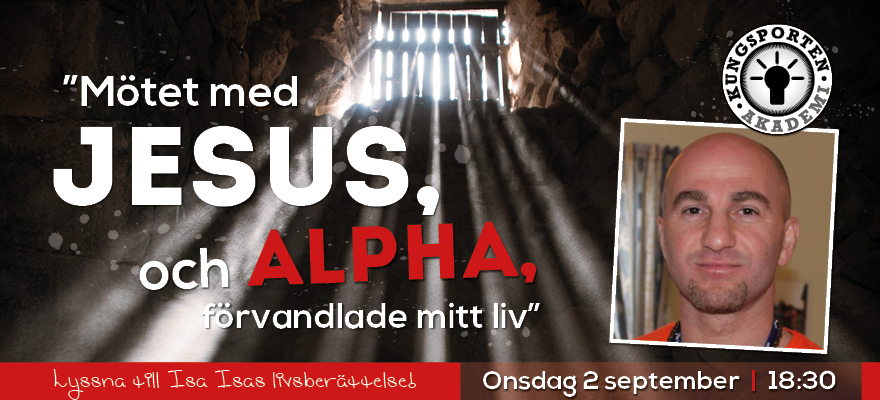 Temat för höstens första Kungsporten Akademi är ”Mötet med Jesus, och Alpha, förvandlade mitt liv!” Isa Isa kommer då att dela sin livsberättelse om hur mötet med Jesus, och fängelse-Alpha, hjälpte honom ut ur ett liv i kriminalitet.