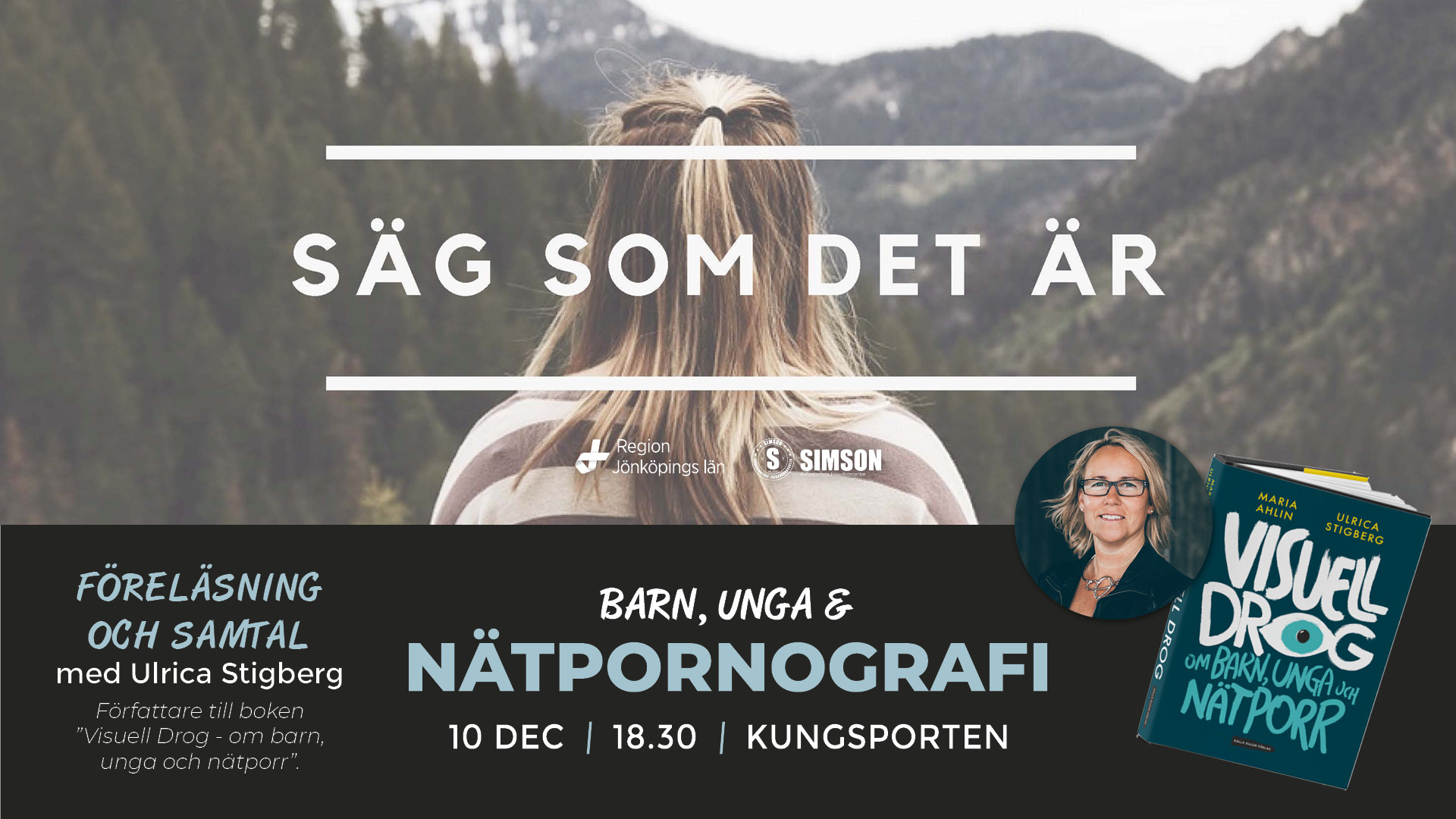 Välkommen till en föreläsning och samtal med Ulrica Stigberg, författare till boken "Visuell Drog - om barn, unga och nätporr" måndagen den 10 december kl. 18.30. I samarbete med Region Jönköpings län och Kungsporten Friskvårdscenter.